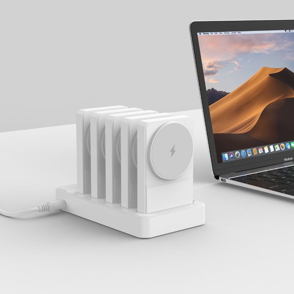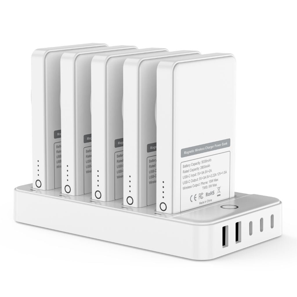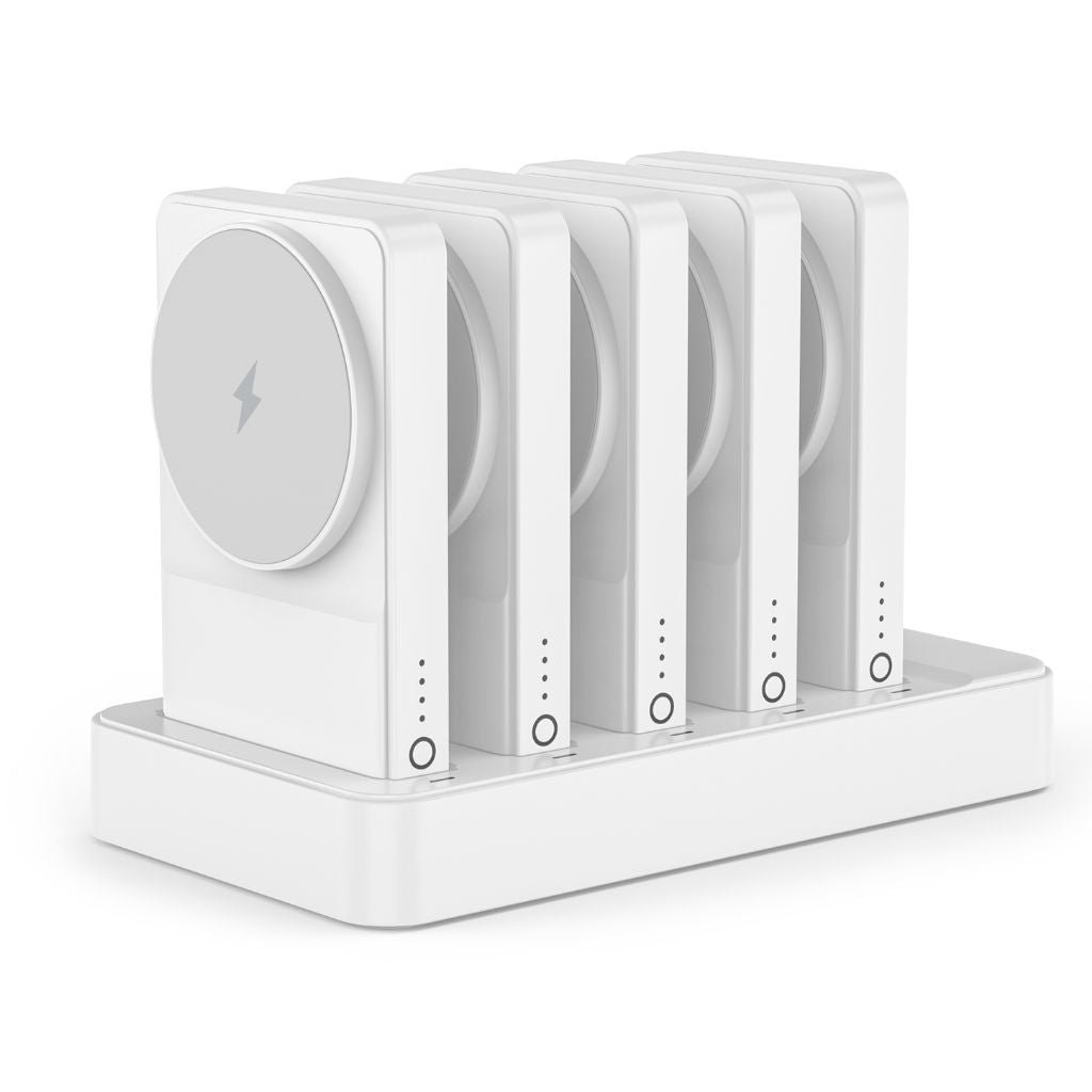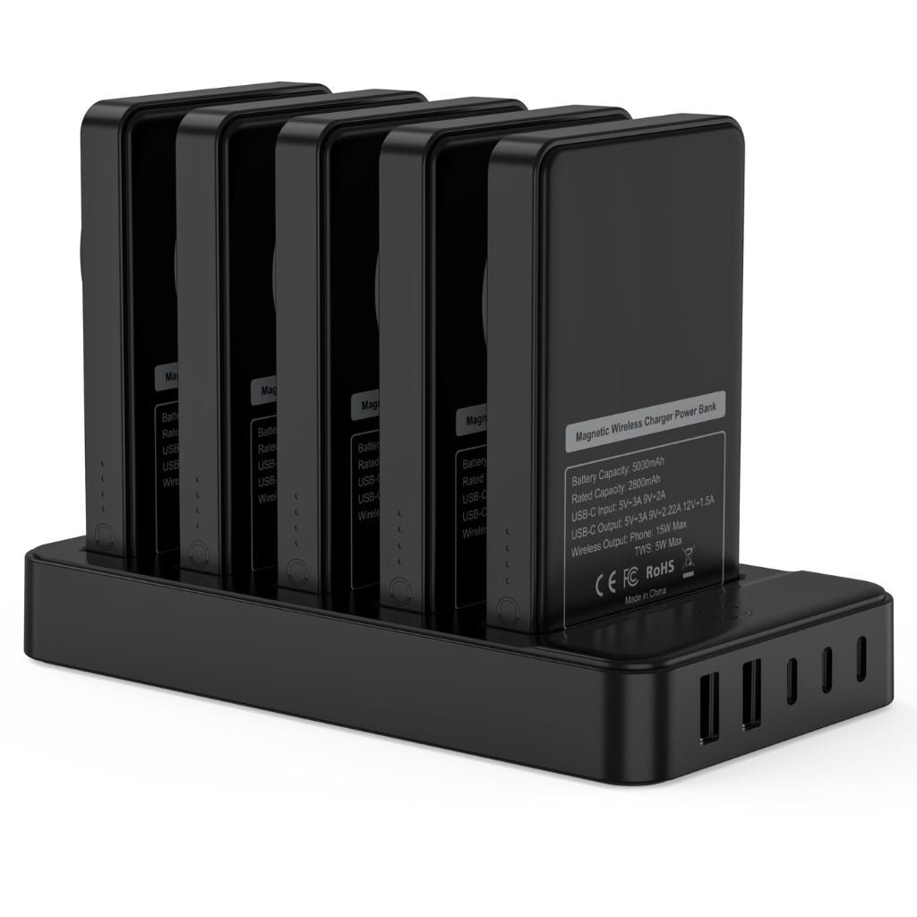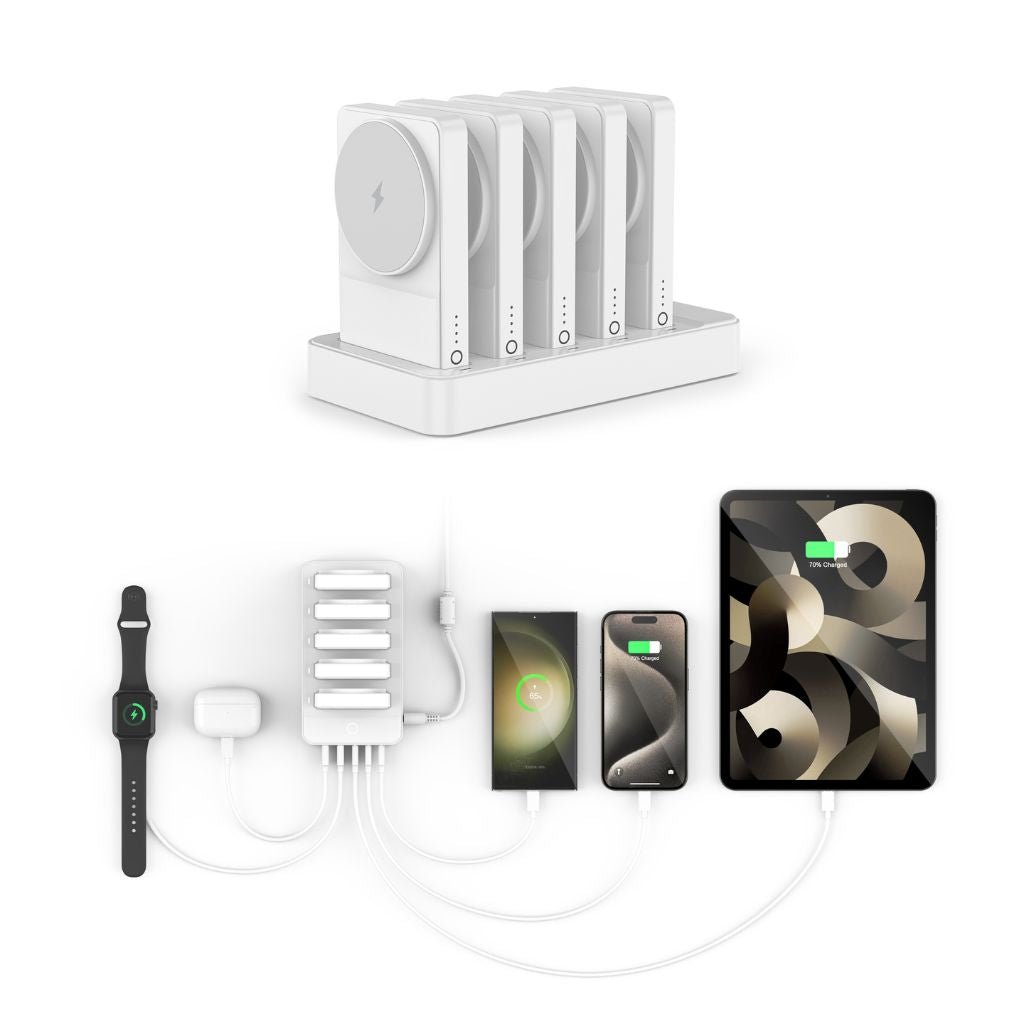 Power banks recharge via magnetic contact or USB-C input, and the dock runs on a 12V/6A DC connection.