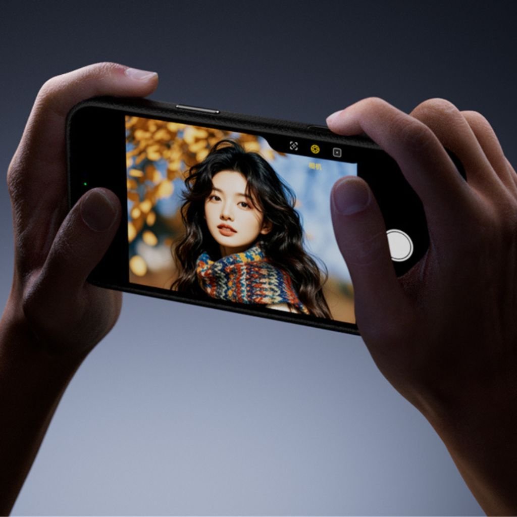 Shock-absorbing frame with raised edges for screen and camera safety.
