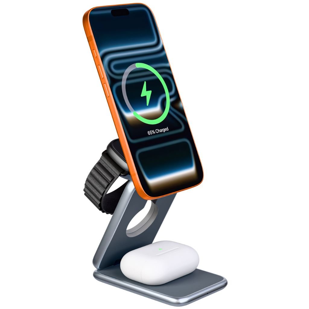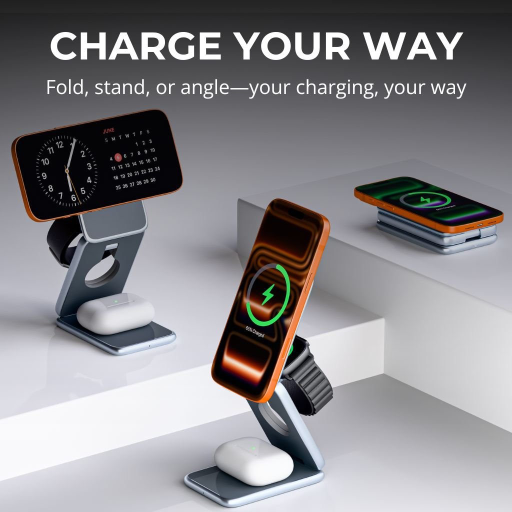 Slim and compact design folds flat, perfect for travel, work, or bedside charging.